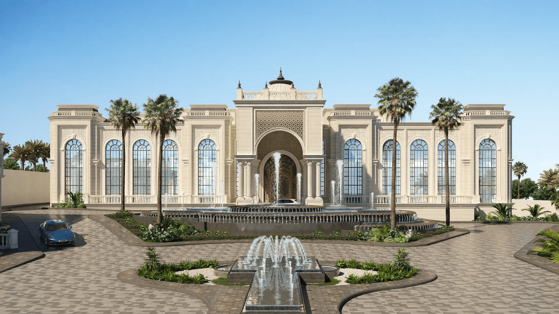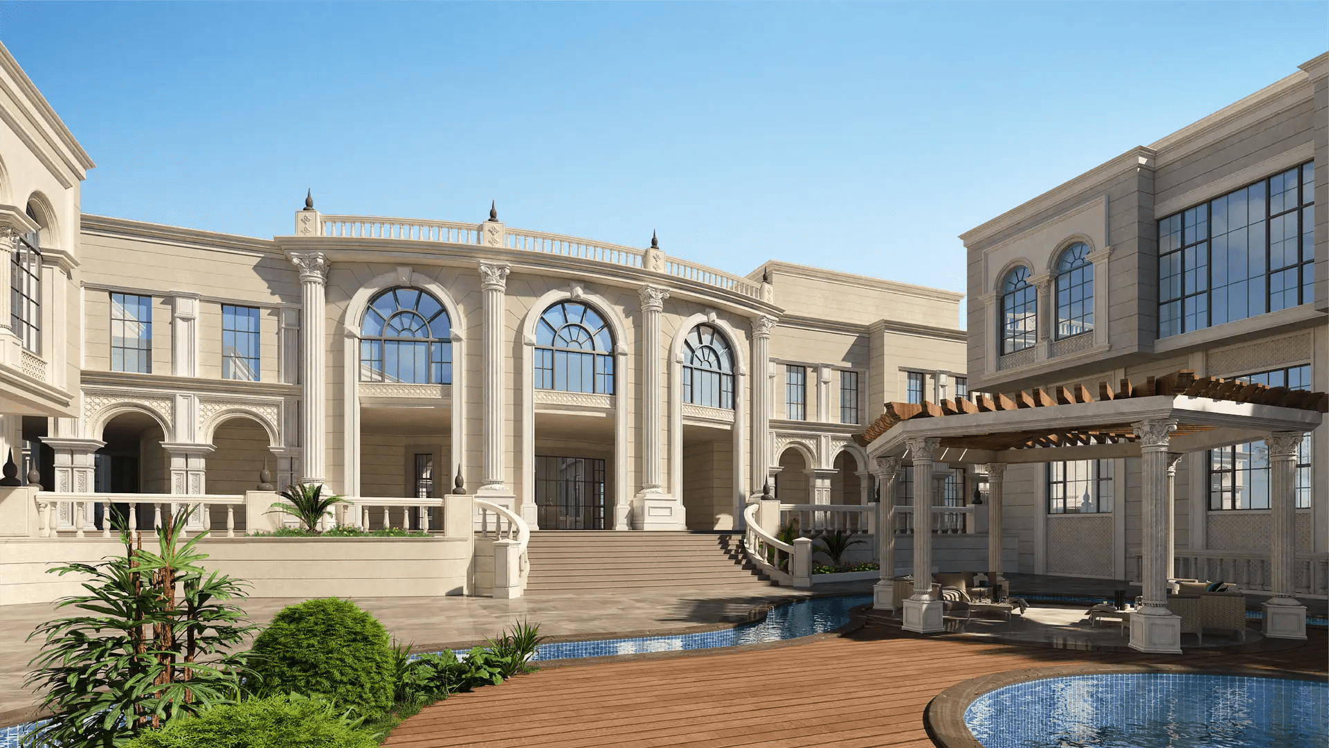 The majestic arches and columns emphasize classical influences, while the landscaped courtyards and water features enhance the overall sense of opulence and serenity.